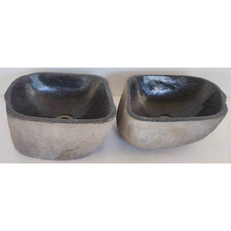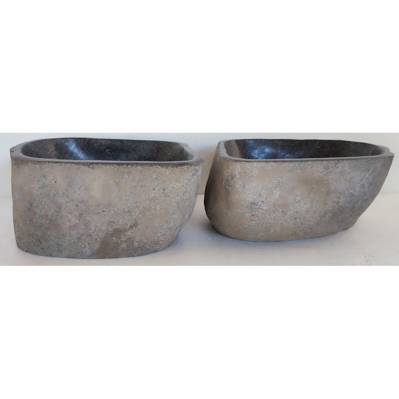 Vasques à poser en pierre naturelle, taillées dans la masse d'un galet de rivière.