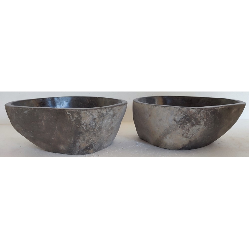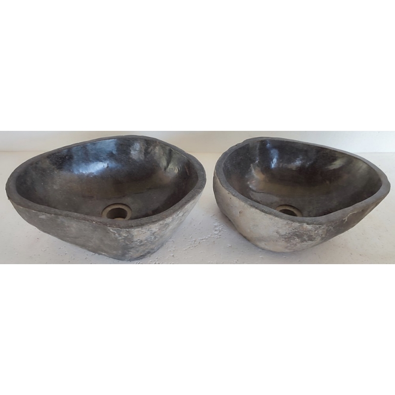 Vasques à poser en pierre naturelle, taillées dans la masse d'un galet de rivière.