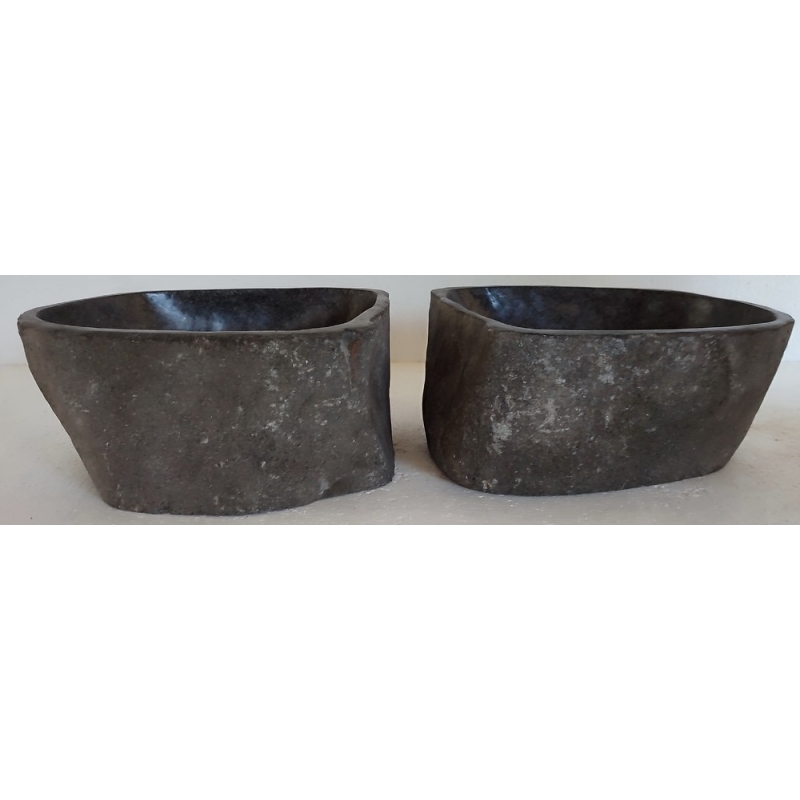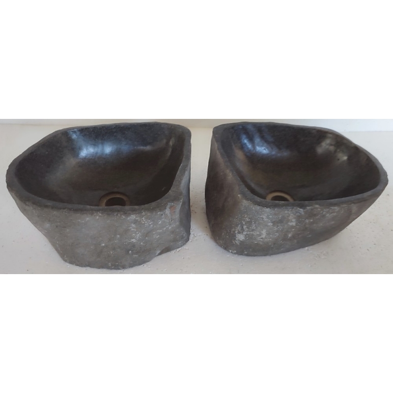 Vasques à poser en pierre naturelle, taillées dans la masse d'un galet de rivière.