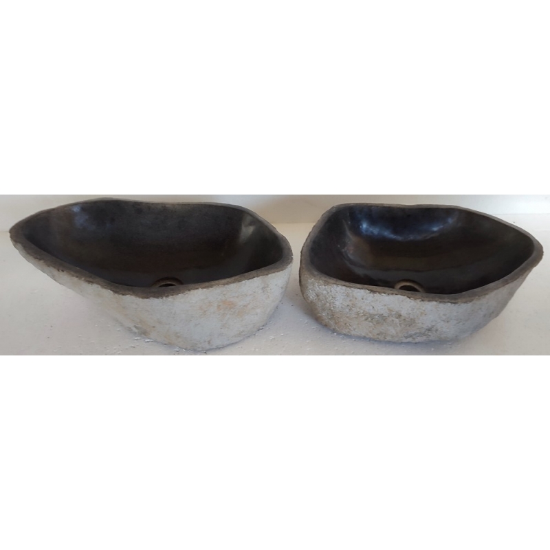 Vasques à poser en pierre naturelle, taillées dans la masse d'un galet de rivière.