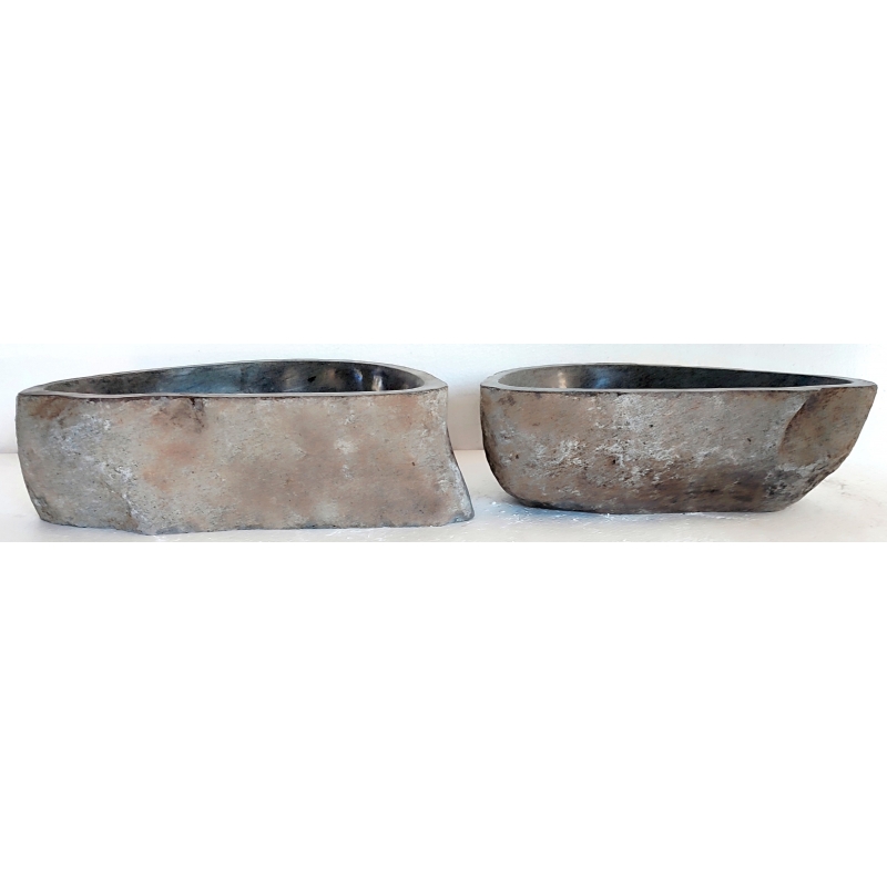 Vasques à poser en pierre naturelle, taillées dans la masse d'un galet de rivière.